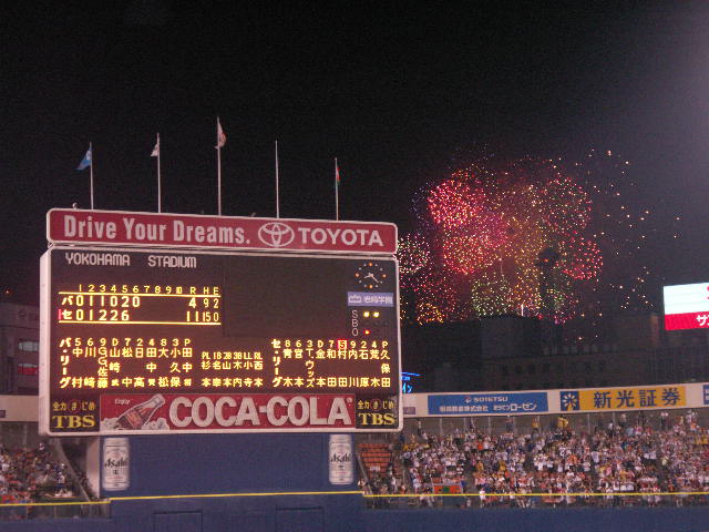バックスクリーン越しには同じ日に重なったみなとみらいの花火が打ち上げられる中、ホームランの打ち合いのような乱打戦。
